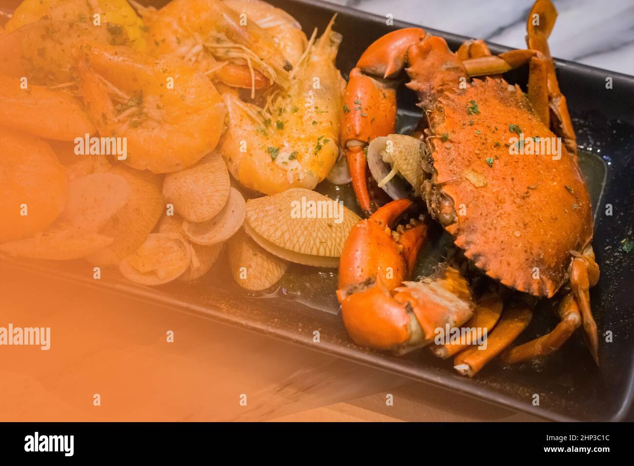 New England Crab Boil Served On Black Plate Crab Prawn And Manila Clams Mix With Old Bay Seasoning Stock Photo Alamy